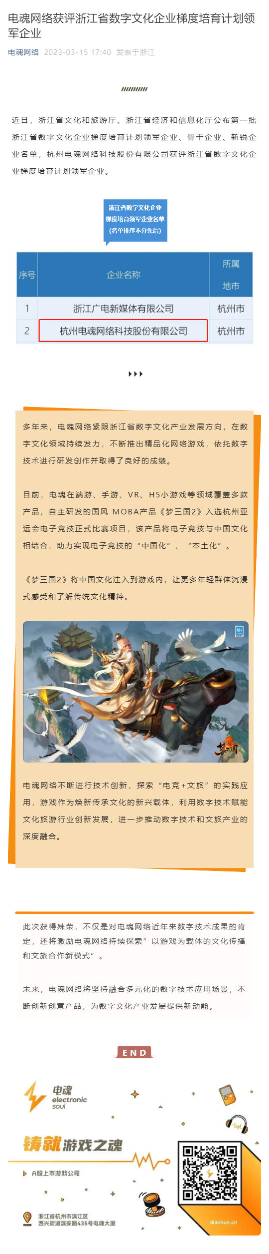 電魂網絡獲評浙江省數字文化企業梯度培育計劃領軍企業